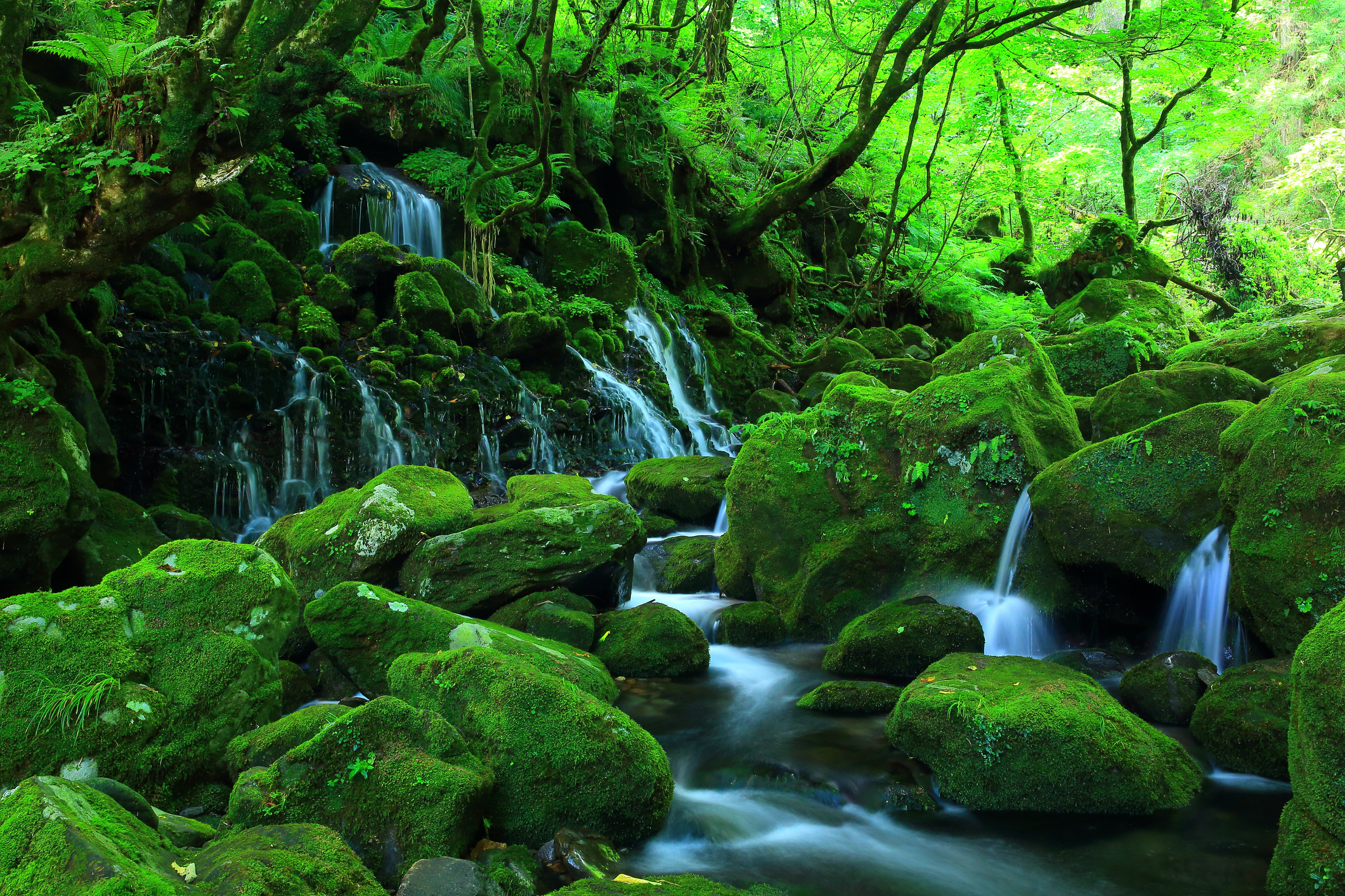 日本海からの湿った空気の影響で年間12000ミリを越える雨や雪が降ることもあるこの一帯には有名な滝がいくつかあるが、その代表格と言えるのがこの元滝伏流水。苔むした岩の間から流れ出した伏流水がつくりだす天然のカスケードは写真愛好家に人気の撮影スポットでもある。